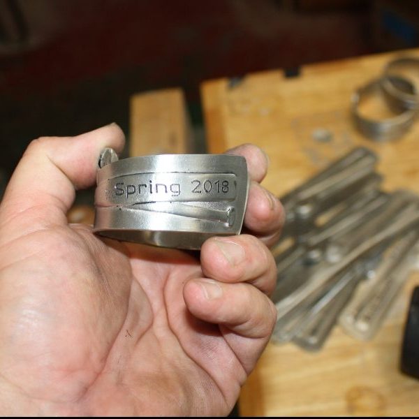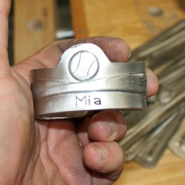 Gone are the days of trashy plastic trophies that no one likes when you purchase these for your softball team. These pewter cuffs started when my daughter’s softball team said they were looking for a trophy that people wouldn’t dump in the attic and forget about. I stepped up to the challenge and told them that I could make something no one has before. So after a few days of mold making, I came up with these cuffs which were a big hit with the team and had gained so much popularity that all the other teams asked for their own. We even make one for the coach which can be mounted on a plaque made of locally cut cypress but can be changed to whatever wood you might want. We can even engrave the team’s name and the player’s name on the cuff. I used the back of the cuff to put my message on to the team a lot of room to say what you want. These cuffs were a fantastic trophy and I still see them being worn around the school to this day. Made in the USA my Fugawee.